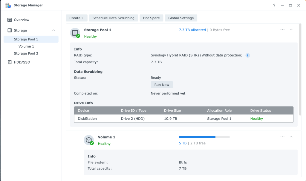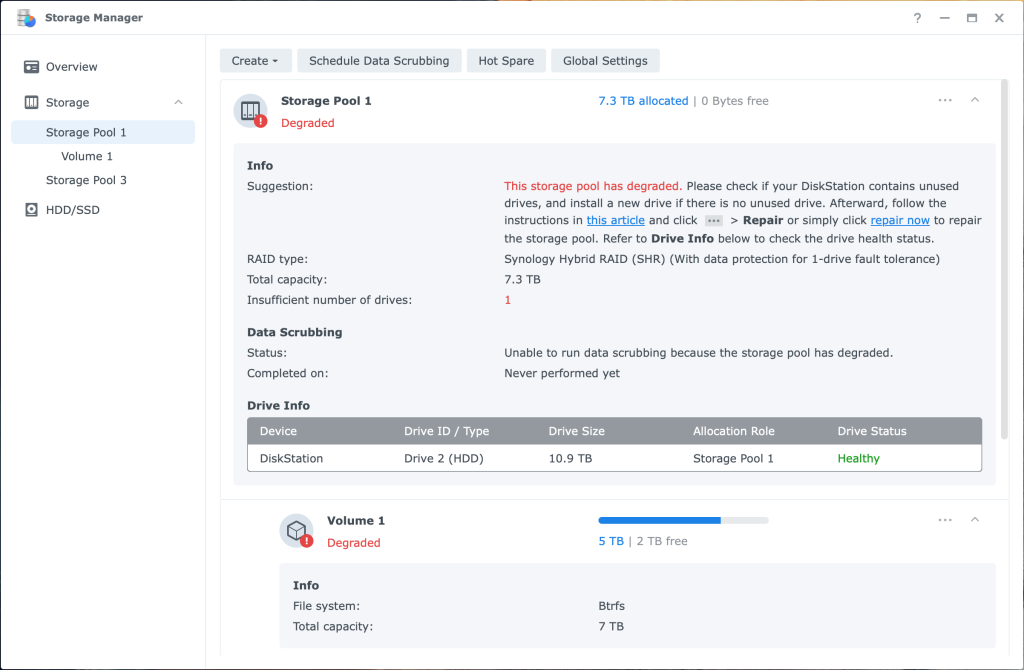 If you have a Synology SHR‑1 storage pool “with data protection” and the second disk has already been deactivated, you may notice the RAID still shows as degraded. Currently it isn’t possible in the Storage Manager UI to convert back to a single disk “without data protection”.